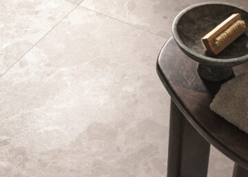 La collezione interpreta l’effetto pietra con ampie inclusioni che permettono di ottenere un’estetica innovativa valorizzata dal lustro, che reagisce alla luce e fa brillare delicatamente le superfici rendendole vive e dinamiche.