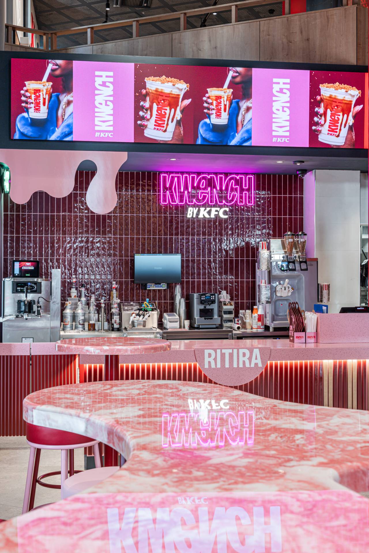 A Beat è stata affiancata la collezione Mold colore Iron, utilizzata per i rivestimenti della zona delivery e per realizzare il grande tondo a contrasto che caratterizza la pavimentazione del “Bucket” tridimensionale realizzato per delimitare la zona per ordinare.